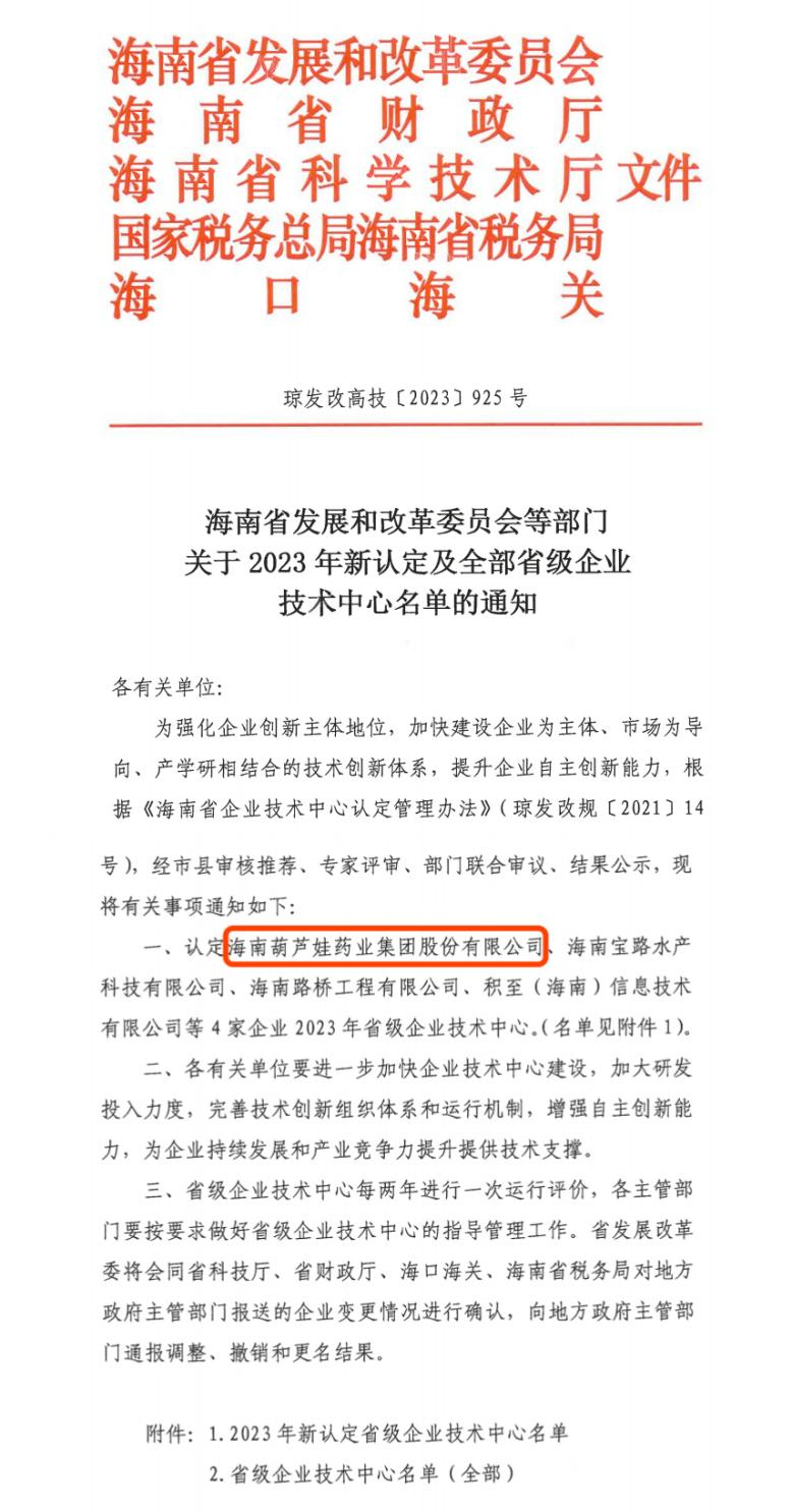 近日,海南省发改委等多部门联合公布了《关于2023年新认定及全部省级企业技术中心名单的通知》,其中,海南尊凯实业药业集团股份有限公司成功通过评审,被认定为省级企业技术中心,是本次获批的4家企业之一。